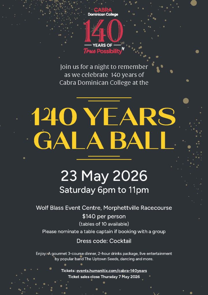 Join us for a night to remember as we celebrate 140 years of Cabra Domincan College at the stunning Wolf Blass Event Centre.